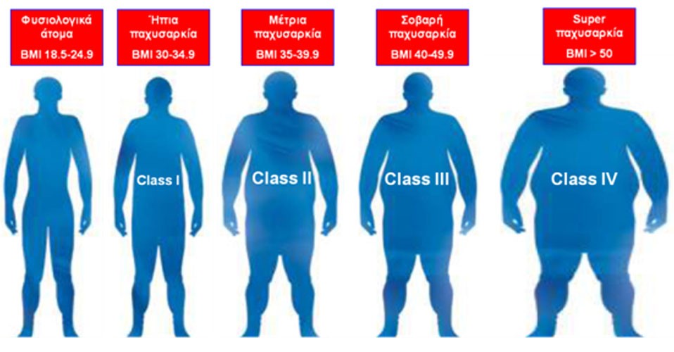 Παχυσαρκία έχουμε όταν το βάρος είναι μεγαλύτερο κατά 20% του ιδανικού ή ο Δ.Μ.Σ(Δείκτης Μάζας Σώματος)ή BMI μεγαλύτερος του 30. Πιο αναλυτικά: